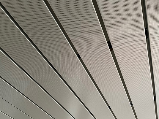 Die perforierten Deckenpaneele können auf Kundenwunsch vom Werk rückseitig mit einem Akustikvlies versehen werden.