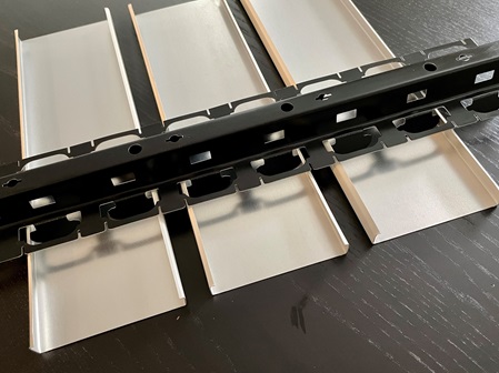 Die Paneele für die DOBNER Metalldeckensysteme mit offener Fuge werden hergestellt aus gewalztem Aluminiumband. Die Legierung ist ALMn 0,5 Mg 0,5 H 44-48, verarbeitet nach EN 13523 oder hochglanzeloxiert aus AL 99,85 (hart) rollformfähig. Die Deckenpaneele werden mittels eines Rollformverfahrens profiliert. Die Materialstärke (Dicke) der Aluminiumpaneele ist wie folgt: